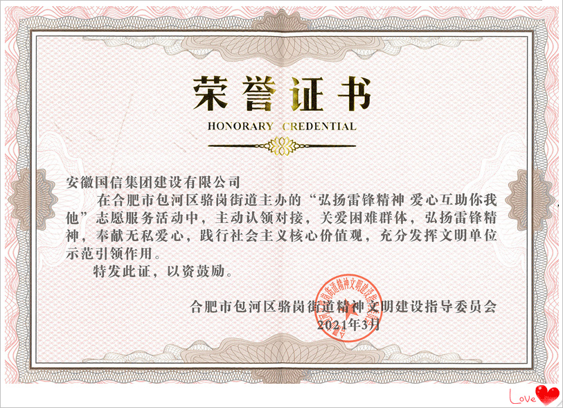 3月5日下午,包河区骆岗街道组织开展学雷锋志愿服务活动,国信集团积极参与,主动认领对接,关爱困难群体,弘扬雷锋精神,奉献无私爱心,向困难群众捐赠所需物资,充分发挥了文明单位的示范引领作用,受到了包河区骆岗街道文明委的表彰。