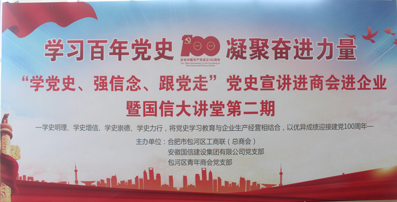 为庆祝中国共产党成立100周年,深入开展以党史为重点的“四史”教育,教育引导民营经济人士坚定不移听党话、感党恩、跟党走,推动党史学习教育在全区商会、企业中走深走实,6月19日上午,由合肥市包河区工商联、安徽国信建设集团有限公司党支部、合肥市包河区青年商会党支部联合主办的“学党史、强信念、跟党走”党史宣讲进商会进企业暨第二期“国信大讲堂”活动隆重举办。包河区工商联全体党员,各商会会长、党支部书记以及部分会员企业党支部书记,国信集团全体党员、全体员工,合肥市包河区青年商会全体党员约180人参加活动。