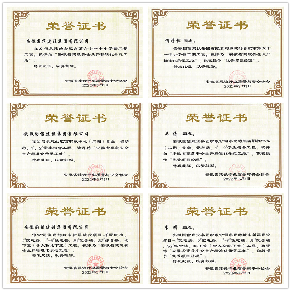 安徽省建设行业质量与安全协会于近日颁发了2021年度第四批“安徽省建筑安全生产标准化工地”和“优秀项目经理”证书,由国信集团承建的合肥市第六十一中小学部二期、肥西职教中心(二期)、城东新居建设项目和何学松、吴涛、李明荣获表彰。