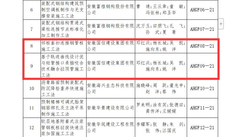 3月15日,安徽省住房和城乡建设厅发布了安徽省2021年度省级工法名单,由国信集团编制申报的《邻桩套扣连接钢管桩施工工法》《基于轨迹曲线设计优与短管接口承插咬合技术融合拉顶管施工工法》被省住建厅审定为安徽省2021年度省级工法。两项工法均是公司总结多年实践经验而成,经多个工程项目运用取得了较好的经济效益和社会效益。