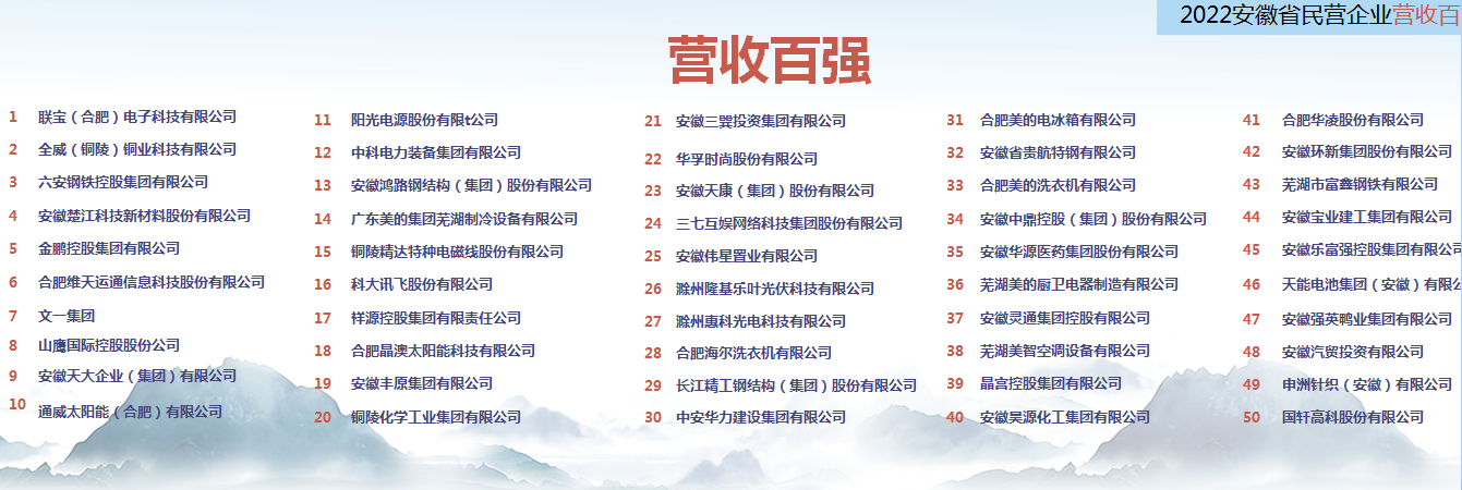 数据显示,2022安徽省民营企业营收百强的入围门槛55.30亿元,较上年增加13.27亿元,增长31.57%,入围门槛连续12年保持增长。另外,百强企业规模实力明显增强,营收百强企业营业收入总额14939.65亿元,较上年增加2364.27亿元,增幅18.83%,营收超百亿企业55家。