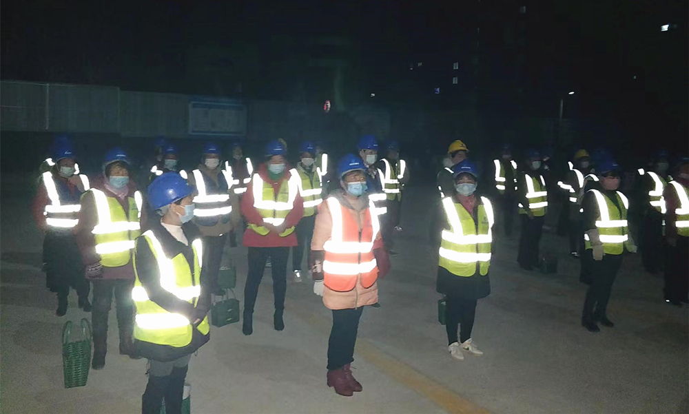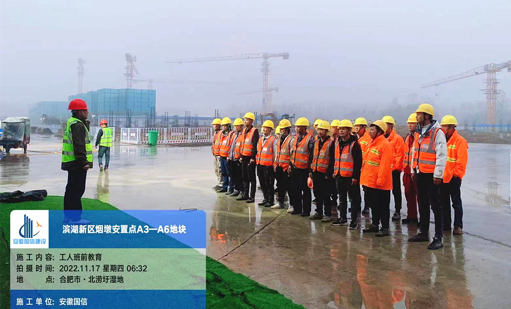 在工地大门口,工友们由班组长带领,在项目部防疫专员、安全员、值班门卫查验过安康码、行程码、核酸报告,经门禁识别后进入到施工现场。安全讲评台前,或工地开阔地带,项目部专职安全员已经到岗,工友们由各班组长召集,根据人数多少,或列成方队,或排成三两行,举行每日班前晨会。班前会开始前,班组长根据花名册对工友师傅们逐一点名,提醒工友检查个人安全防护用品佩戴是否规范,劳动工具是否符合要求,身体状况是否满足工作需要等。接着,班组长或者安全员根据专业不同,分成钢筋工、木工、架子工、塔吊、爬架、水电工等类别,给各工种工友师傅们进行安全注意事项宣讲,宣讲内容根据各班组的施工特点,针对性提出安全施工注意事项,例如高空作业如何保证安全,地下室的有限空间施工注意事项,深基坑作业的安全要点,塔吊等起重作业信号指挥需要注意的事项,以及临边或洞口施工安全等。各班组宣讲完成后,工友师傅们纷纷奔向工作岗位,此时东方的天空已经出现鱼肚白,新的一天已经开始。召开“班前会”、开好“班前会”,是压实安全生产责任的重要举措。这项制度如今已在国信集团各个项目工地全面推进执行,差不多同一时刻,在国信集团的统一部署要求下,所承建的汇金商务中心、肥西柿树岗乡联圩村安置点等全部工地,班前会均如火如荼开展。