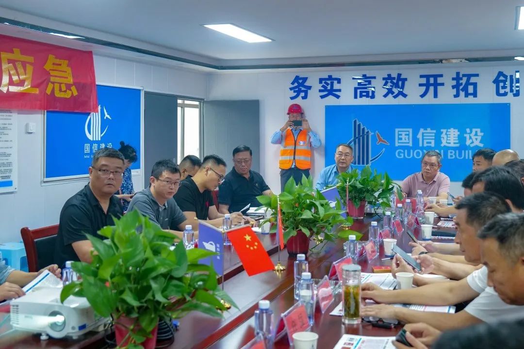 现场观摩结束后,观摩团队召开会议,听取了国信集团关于项目建设的总结汇报,大家就本次观摩参观进行了深入的沟通交流,对国信集团项目团队在施工中的诸多良好做法给予了肯定和好评。最后,名邦地产集团常务副总裁李宽洲对本次活动作总结发言,他对目前的施工效果和质量表示了肯定,并强调在后期的施工过程中继续严格遵守“质量安全齐发展”的建设理念,在保证安全施工的前提下,确保工程质量,全力推进项目建设,用品质树立标杆。