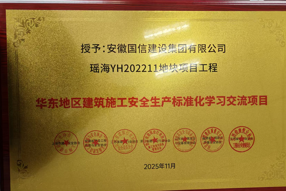 近日,华东地区建筑安全联席会五届四次会议在青岛召开,会上发布了《关于公布2025年华东六省一市建筑施工安全生产标准化工地学习交流活动名单的通知》,国信集团承建的瑶海YH202211地块(汇东商务中心)项目位列榜单,获评“华东地区建筑施工安全生产标准化学习交流项目”。