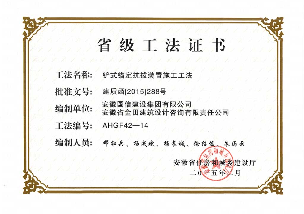 省级工法:铲式锚定抗拔装置施工工法