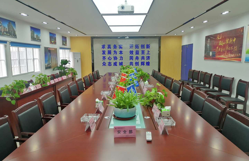 办公楼正立面及两侧采用全玻式可开启节能幕墙,能有效避免外界噪音及扬尘,且能控制光线、调节热量、节约能源,改善建筑物环境,增加美感。门厅为凸式钢构结构,大门采用全玻式钢化玻璃电子感应门,厅前一株迎客松恭迎八方来客。办公楼内分设经理办公室、部门办公室、财务室、档案室、会议室、党员活动室,文化宣传墙美观大气,“七牌一图”配置到位,岗位职责、各类规章制度等全部采用亚格力材质,按照标准尺寸、颜色制作悬挂到位。超大的会议室能够同时容纳约40人召开会议,音响设备、投影仪、视频会议系统一应俱全,且采用石膏板天棚吊顶和LED节能灯照明,不但节能环保,还保证了足够的亮度和空间层次。
