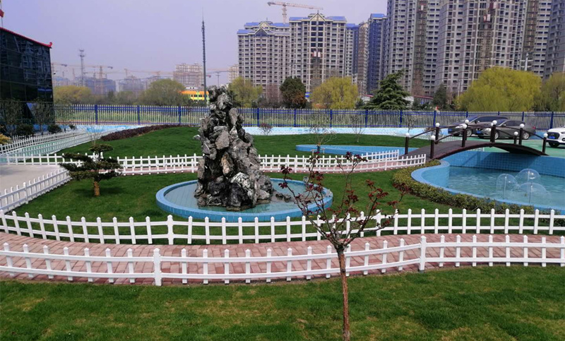 花红草绿的景观园林围绕着办公楼,园内种满了多达十余种花草,植被覆盖率在30%以上,基本做到四季绿树常有、花开不断。正对驻地大门,还设有音乐喷泉,白天与花草相映成趣,夜光下更显灯火斑斓。喷泉水池中时有金鱼戏水,水池两肩上跨2座仿古拱桥,旁边椭圆形假山池有溪水流淌,草皮上仿石音箱传出美妙音乐,园内绿色环氧地坪漆道路整洁干净,曲线形人行道铺设双色透水砖,项目部在“花园式”驻地建设上花足了功夫。