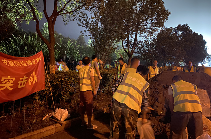 凌晨时分,面对巢湖水位仍在上涨的危险情况,国信抗洪抢险突击队积极与“洪水”进行着时间赛跑,紧急利用沙袋设置堤坝,对巢湖沿线做好沙袋防护,严防死守洪水漫入城区。大堤上、道路旁,蚊虫叮咬,他们来不及拍打;为运沙袋,他们浑身是泥,里外湿透;为节约时间,他们顾不上休息和吃饭,连喝水都争分夺秒。漫漫黑夜中,突击队员们连续奋战近7个小时,直至早晨7点钟,在大家的齐心协力下,环湖大道滨湖段已筑起一道“安全堤坝”,现场险情基本得到控制。